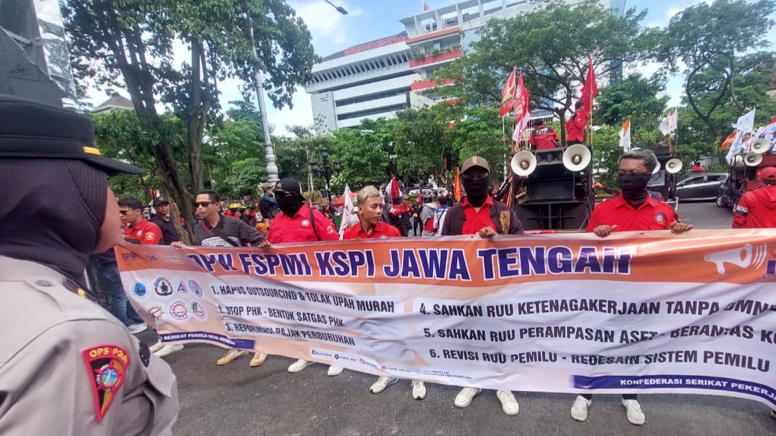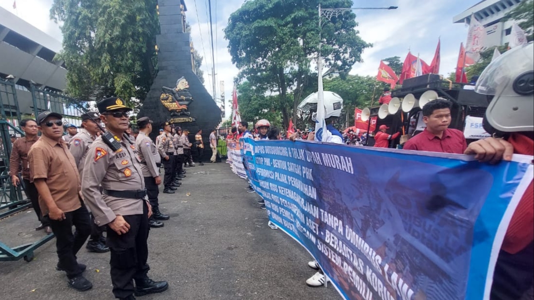 Massa tiba sekitar pukul 14.00 WIB dengan pengawalan polisi, lalu menyampaikan berbagai tuntutan, mulai dari penghapusan outsourcing, penolakan upah murah, hingga pembentukan Satgas PHK dan pemberantasan korupsiMassa disambut tim negosiator Polwan yang memberikan imbauan persuasif agar penyampaian aspirasi berjalan damai.
