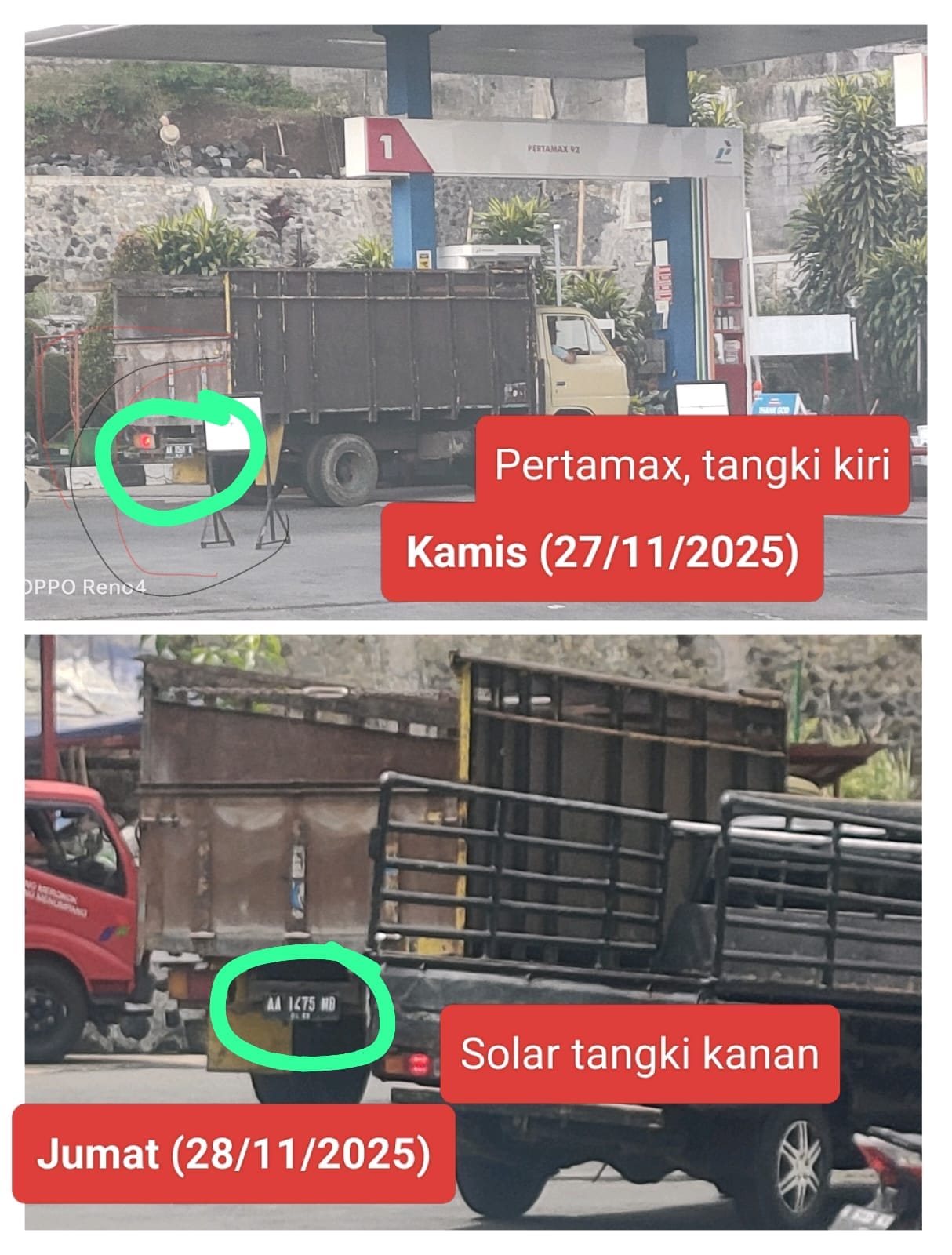 – Truk dipasang Plat Nopol AA 1475 MB untuk membeli BBM jenis Pertalite di SPBU di tangki sebelah kiri.