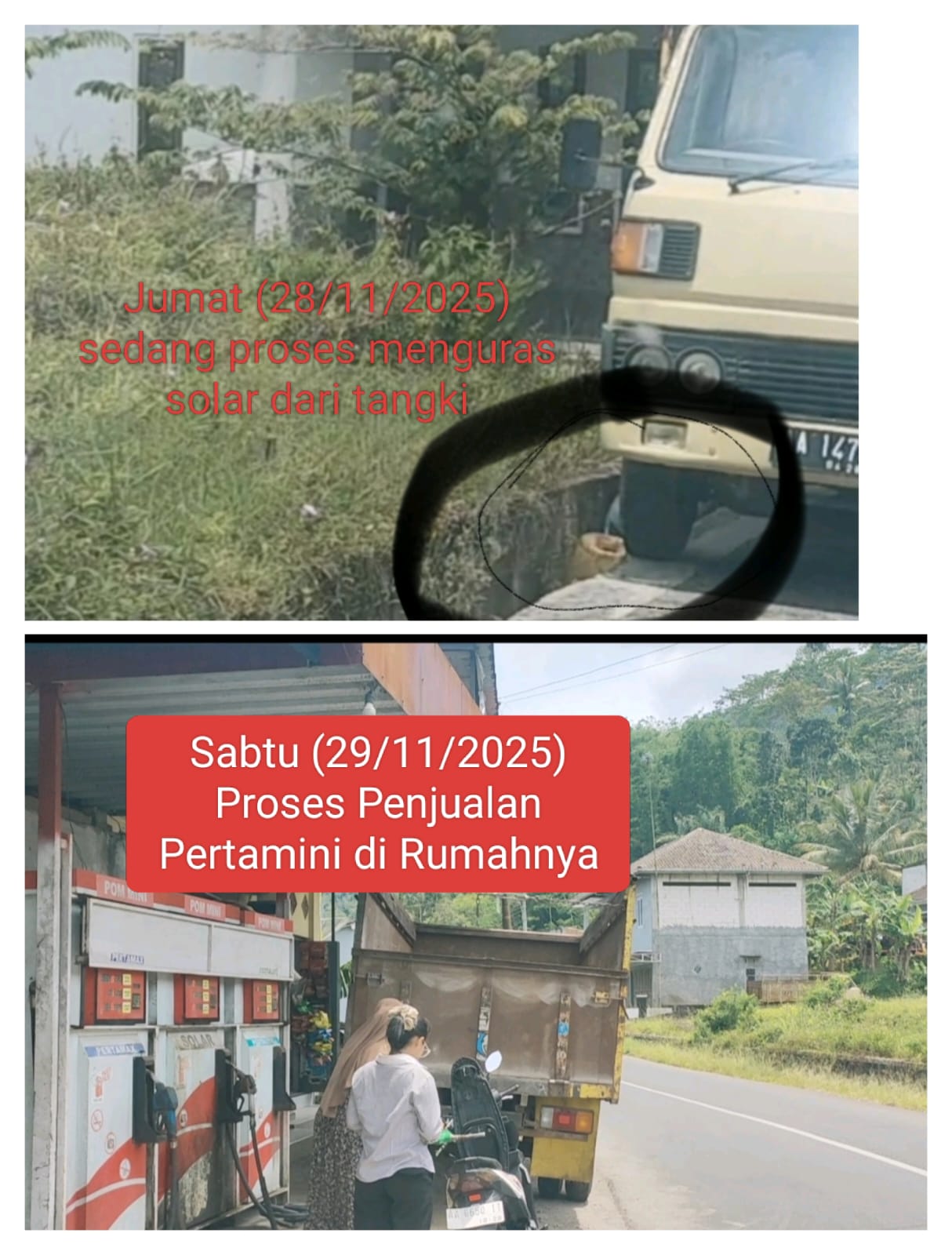 Dengan informasi tersebut, akhirnya dimulai hari Kamis (27/11/2025) s/d Sabtu (29/11/2025) kemarin, Tim melakukan investigasi. Dan selama tiga hari ini, ternyata benar adanya informasi tersebut, selama tiga (3) hari Tim mengikuti kegiatan keseharian dari Pak Min (sapaan akrab warga sekitar). Dimulai ia membeli BBM di SPBU sampai dengan ia menguras tangki BBM di depan rumahnya setelah membelinya dari SPBU.