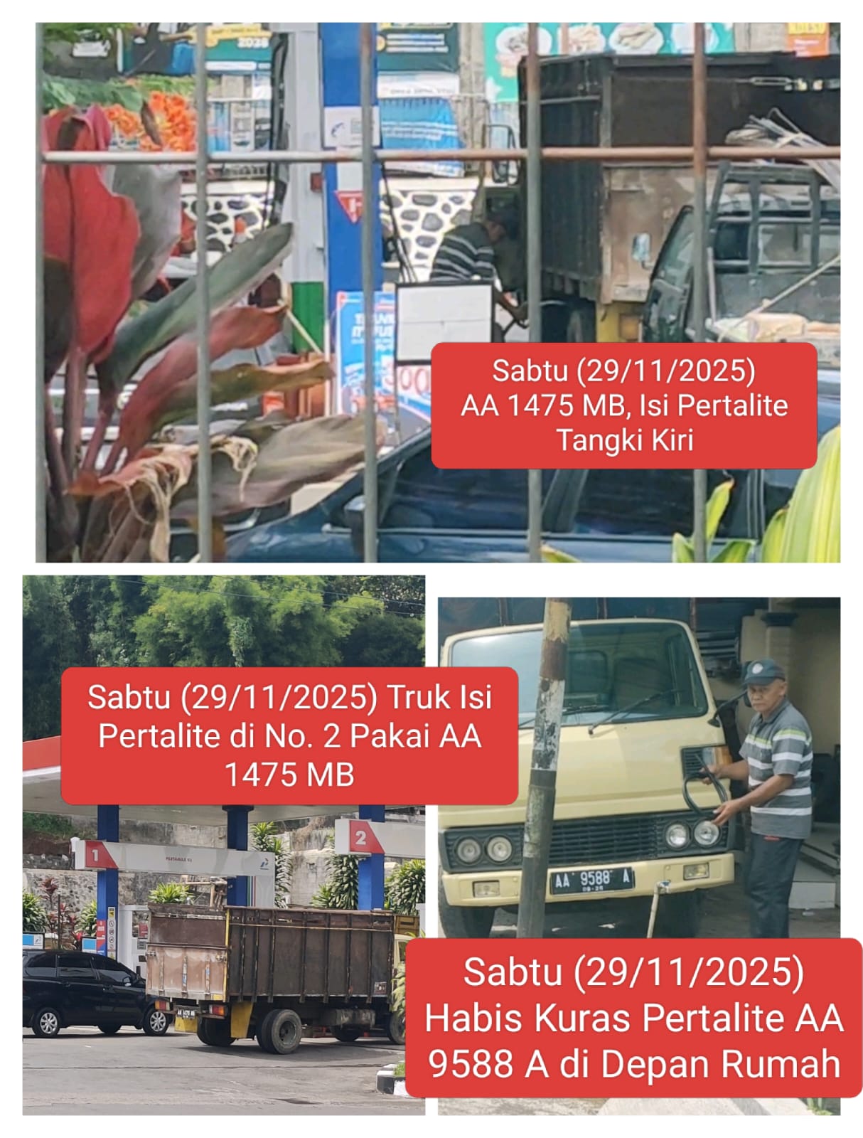 – Truk dipasang Plat Nopol AA 9588 A untuk membeli BBM di SPBU.