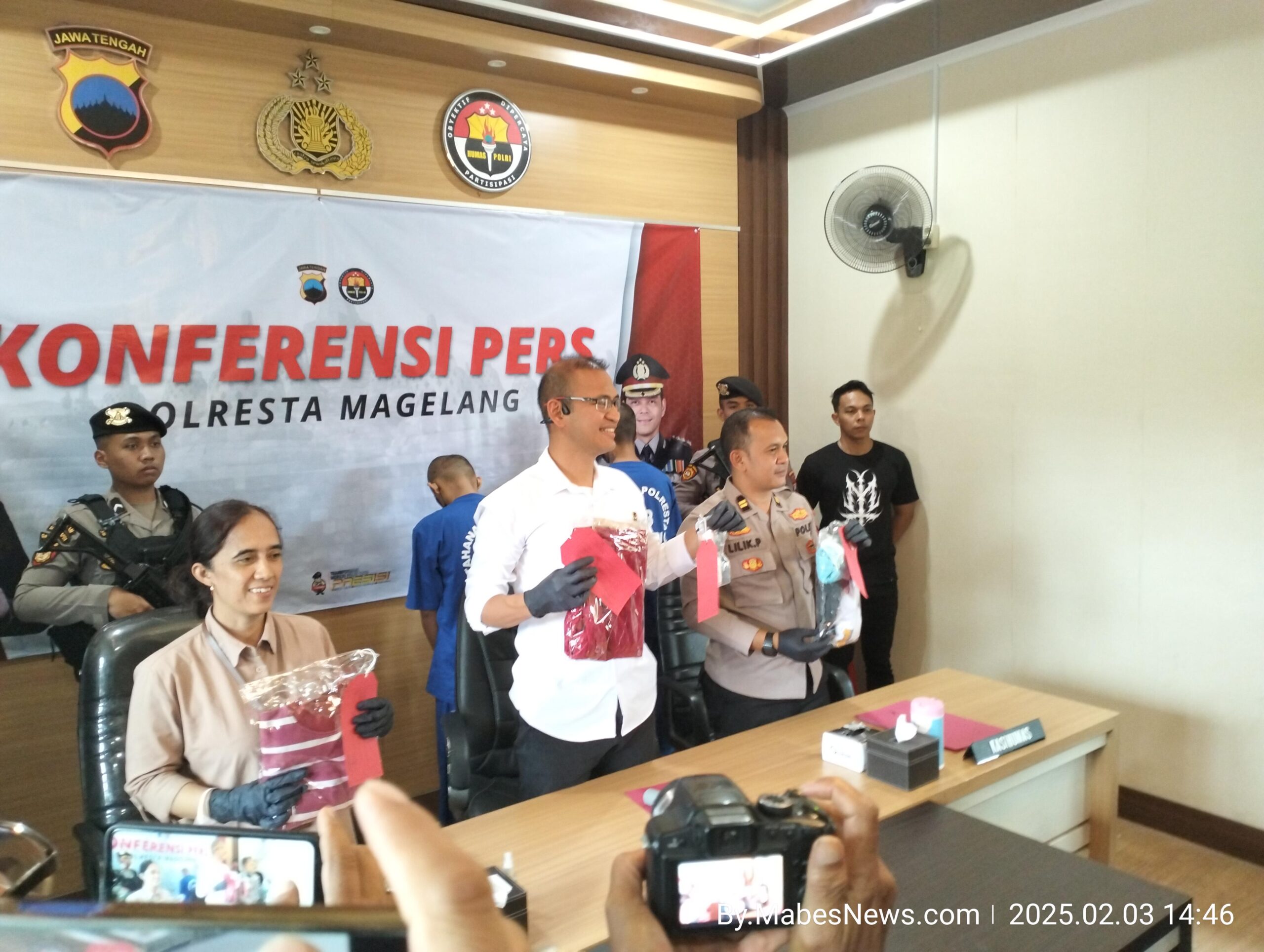 Konferensi Pers dipimpin oleh Kapolresta Magelang Kombes Pol Herbin Garbawiyata Jaya Sianipar, S.I.K., S.H. diwakili Kasatreskrim Kompol Muhammad Fachrur Rozi, S.H., S.I.K., M.H. Turut mendampingi kegiatan PS. Kasihumas Iptu Lilik Purwaka, S.Psi. dan Direktur Sahabat Perempuan, Putri Andhani Prabasasi, S.E.